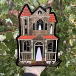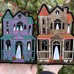 to make these i laser engraved my haunted house drawing into birch panels and then painted them, giving each house their own unique inhabitants. they are sealed with a nice glossy varnish and have a sawtooth hanger on the back for hanging. the small purple house measures about 4 inches tall. the bigger orange and brown one is 8 inches tall.