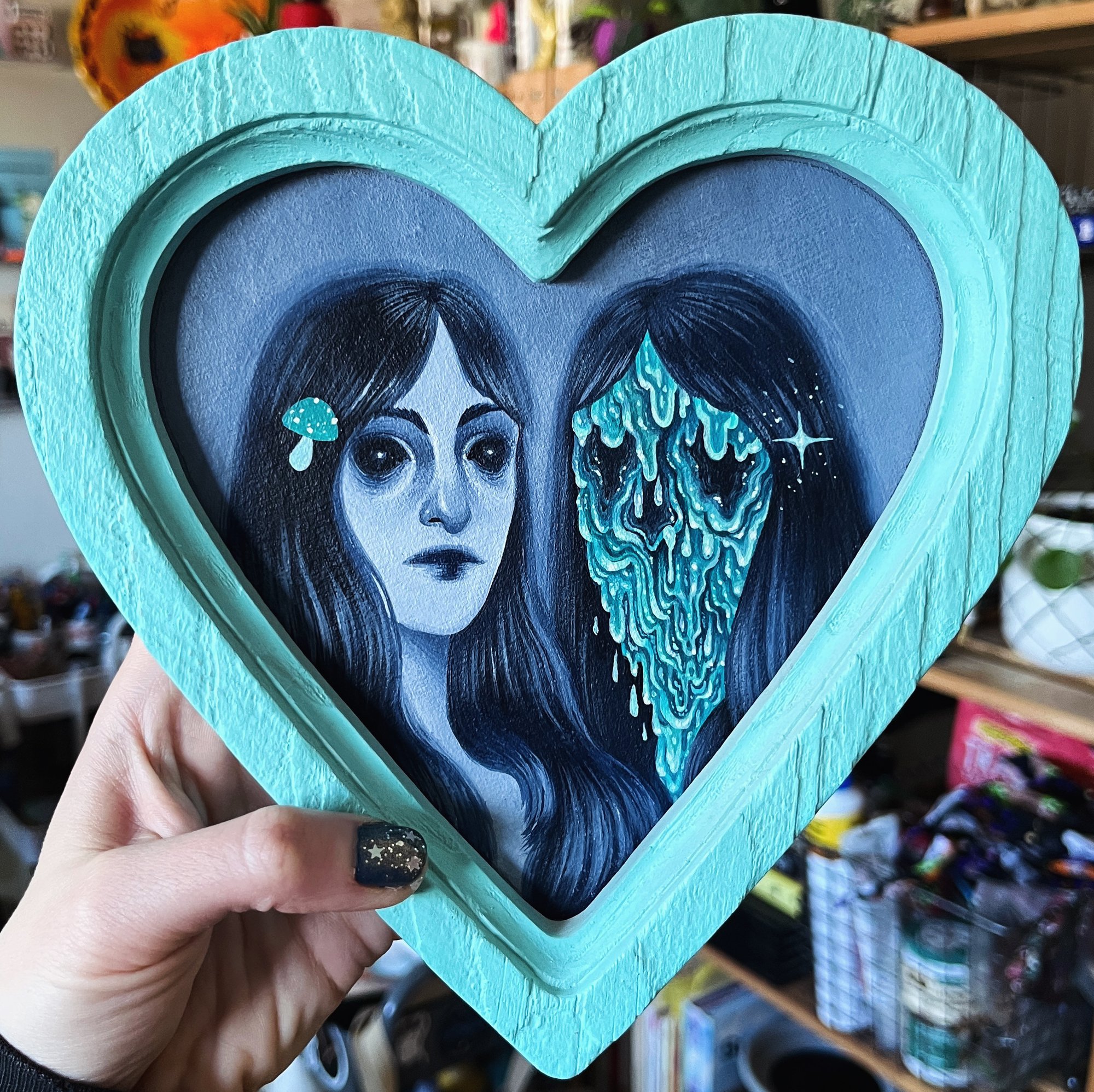 small acrylic painting in repainted vintage plastic frame. ready to hang. painting measures roughly 5x6 inches without frame. 2023.