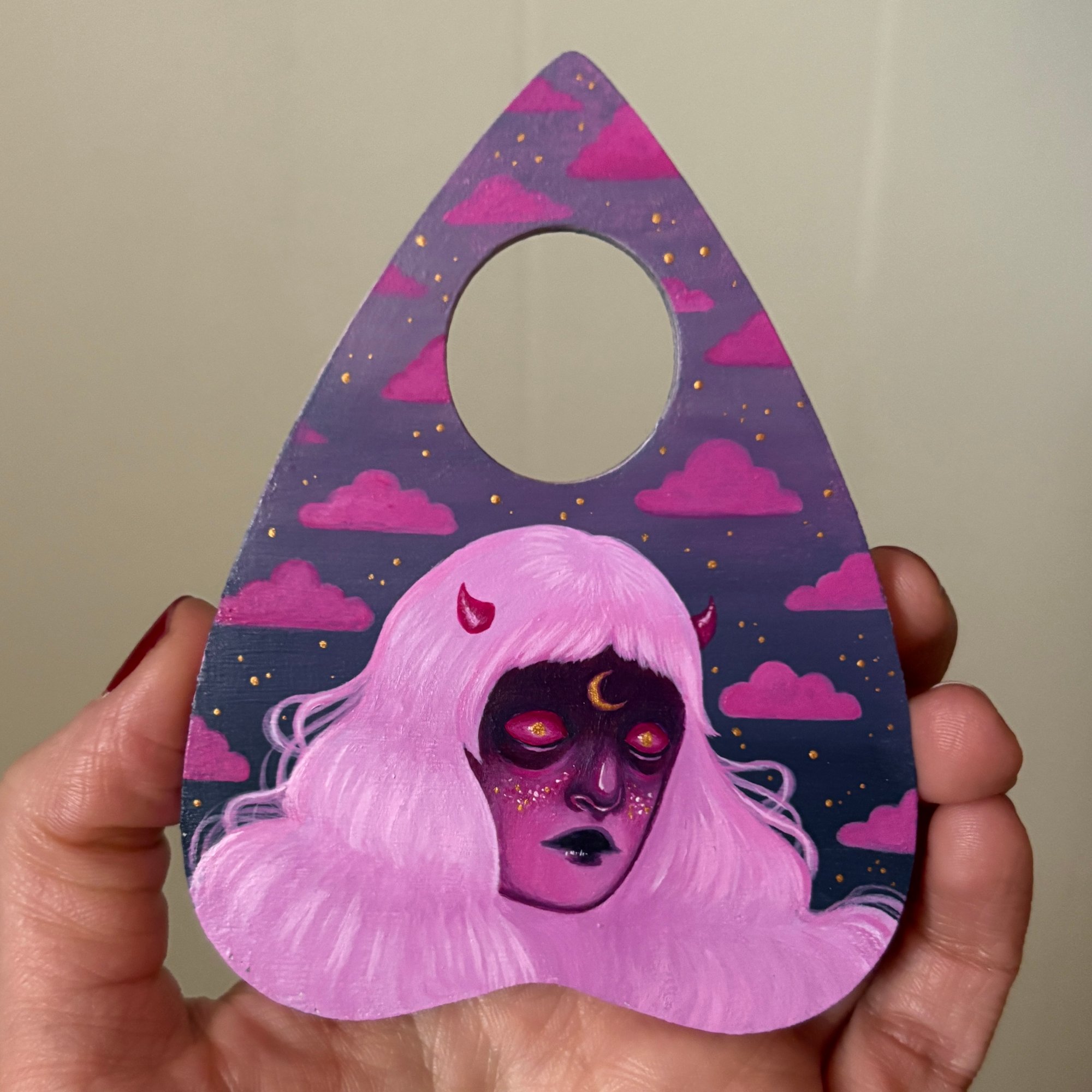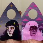 acrylic paintings on planchette shaped wood measuring around 4 inches tall. they are sealed with a protective gloss glaze and have a sawtooth hanger attached to the back. 2026.