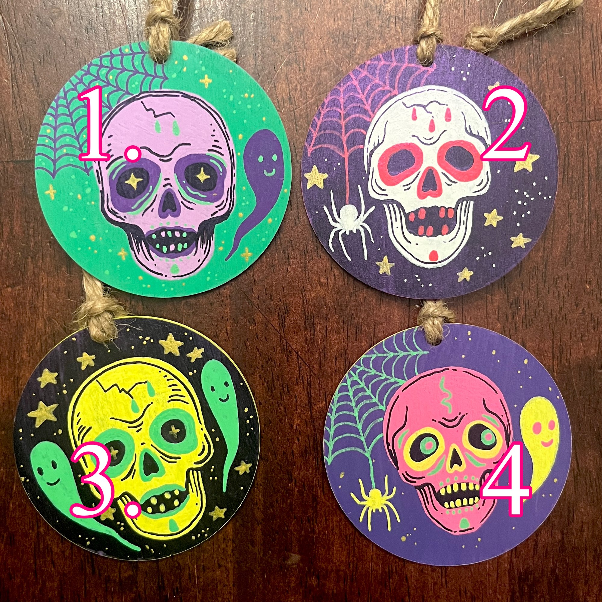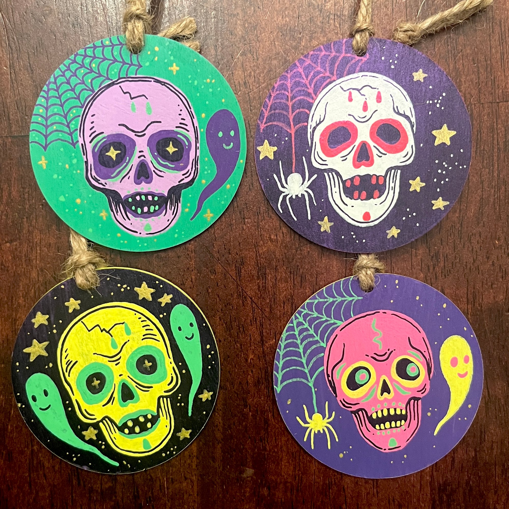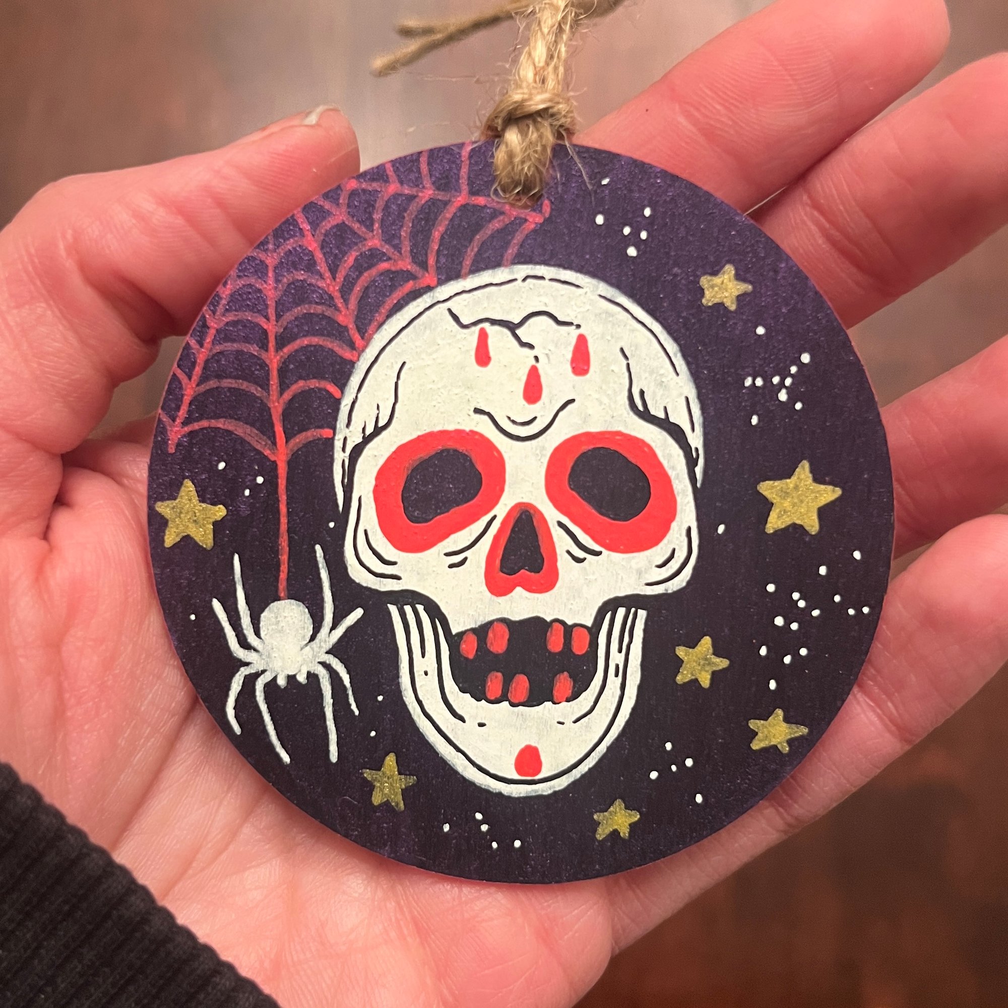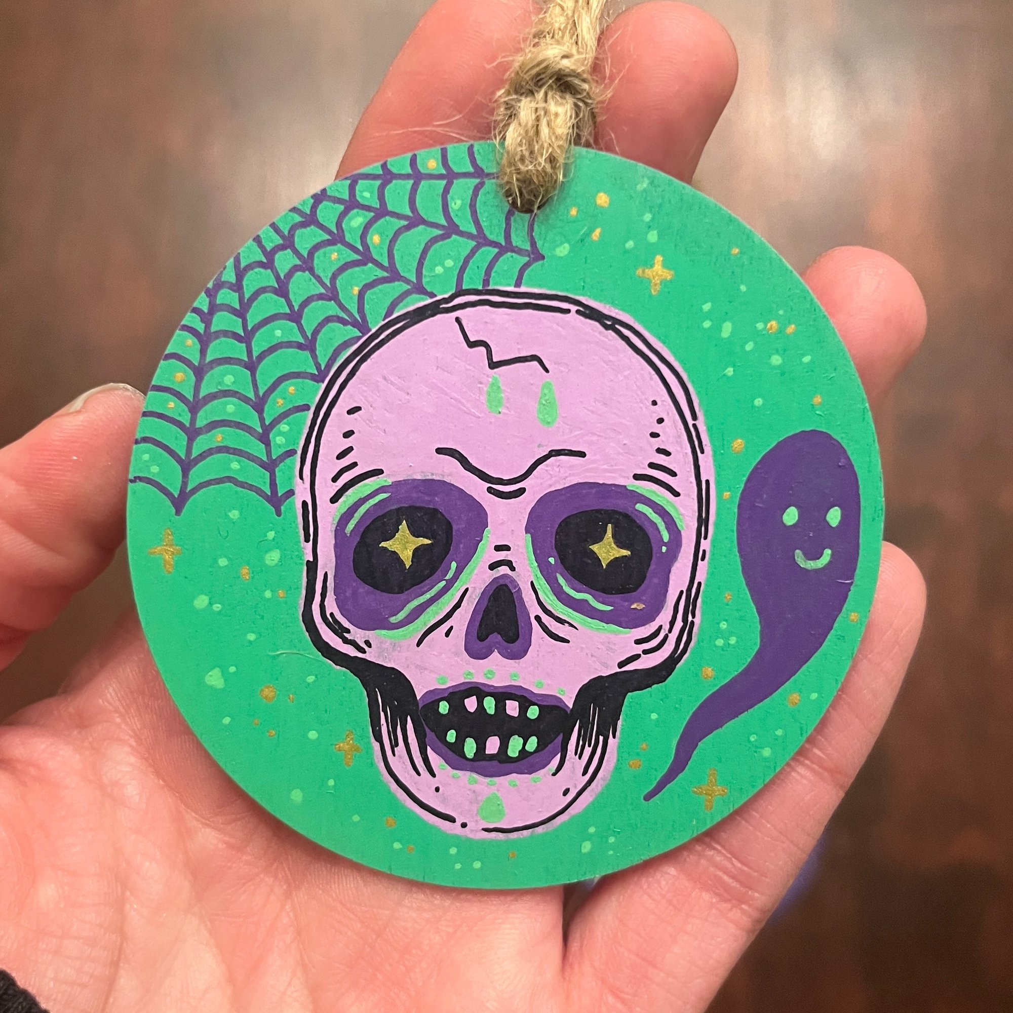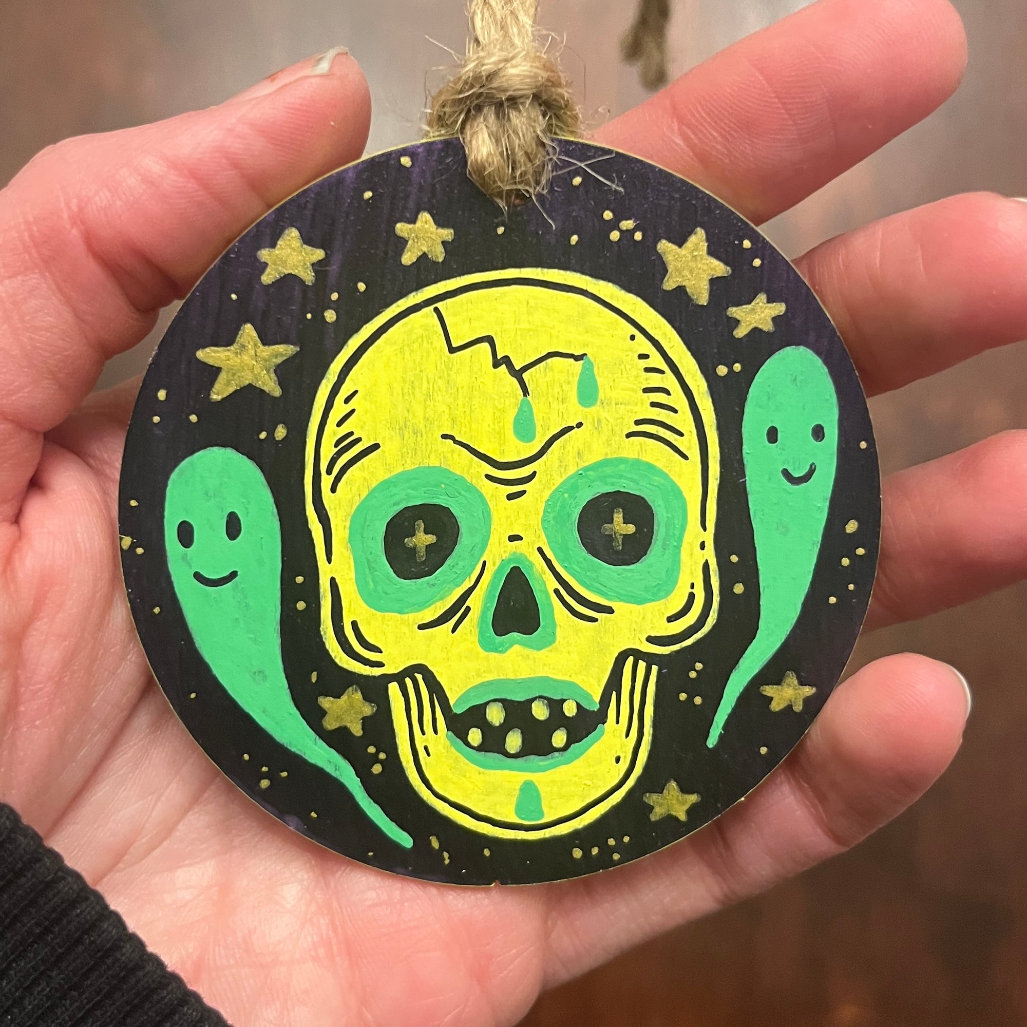wooden ornaments hand drawn with acrylic paint markers measuring 2.75 inches tondo. each ornament is one of a kind and sealed with an iridescent varnish that gives it a subtle shimmer when light hits it.