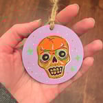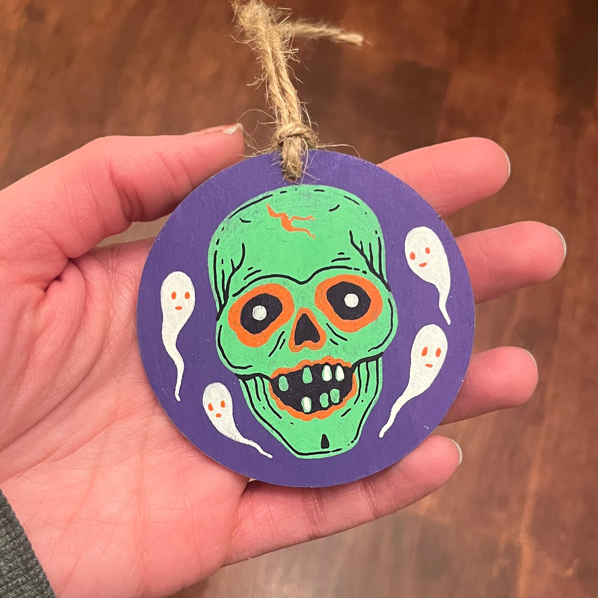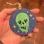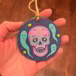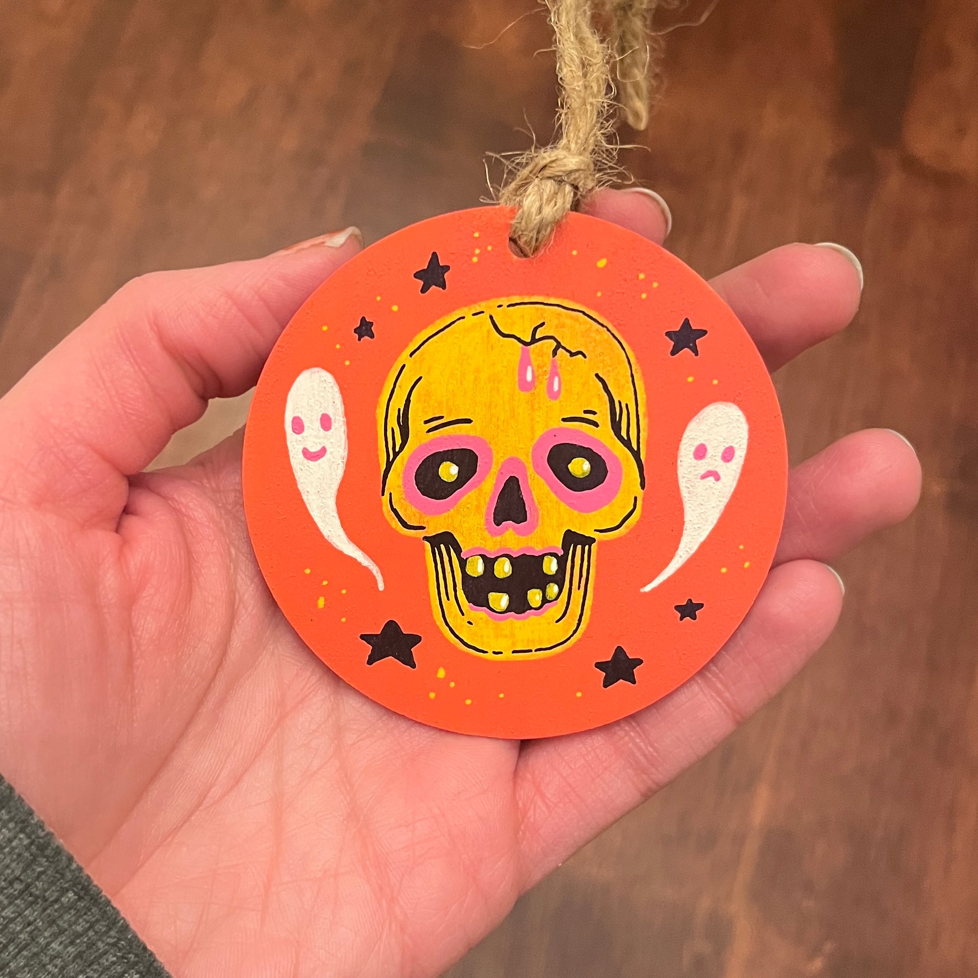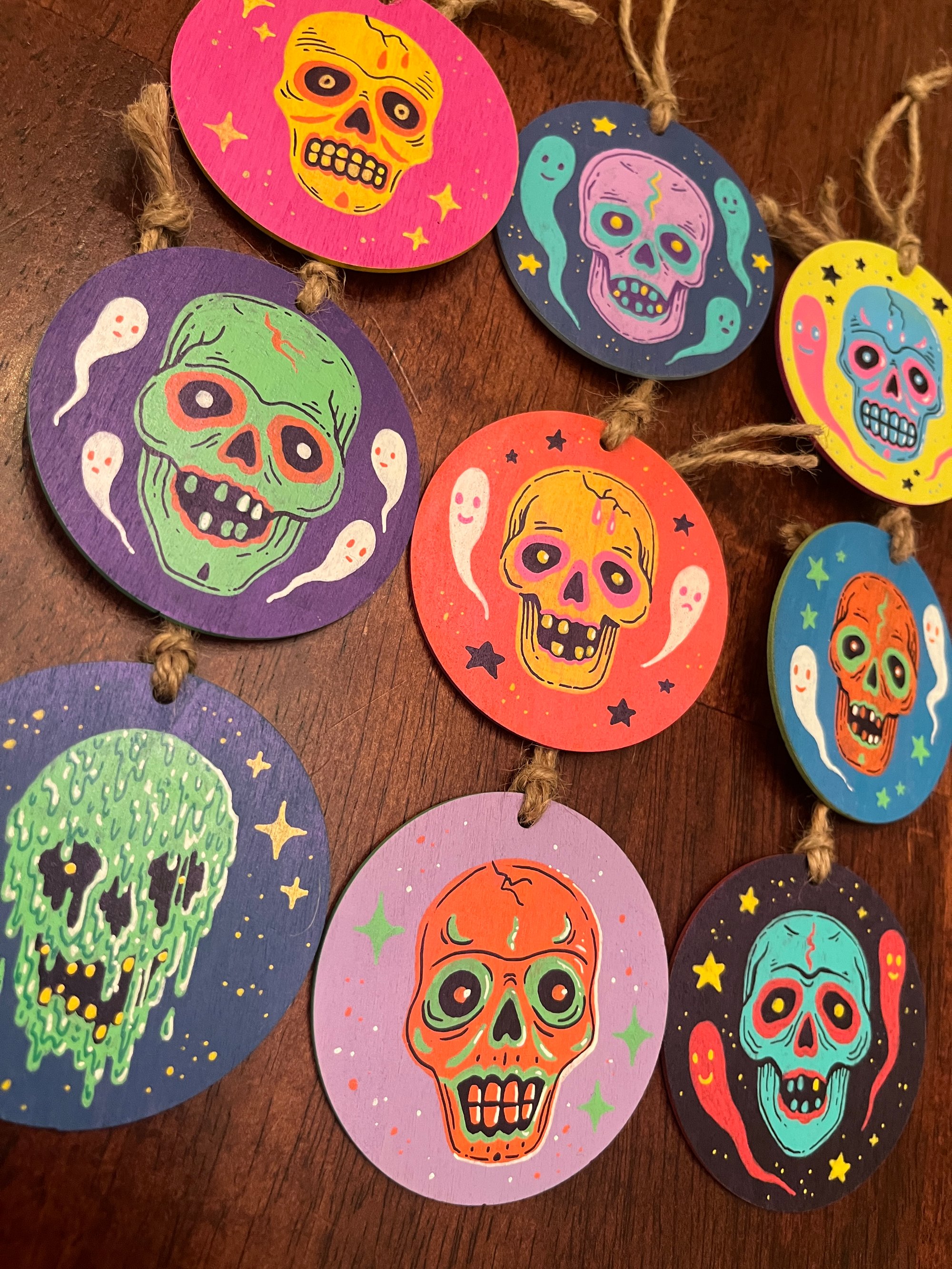 wooden ornaments hand drawn with acrylic paint markers measuring 2.75 inches tondo. each ornament is one of a kind and sealed with an iridescent varnish that gives it a subtle shimmer when light hits it.