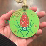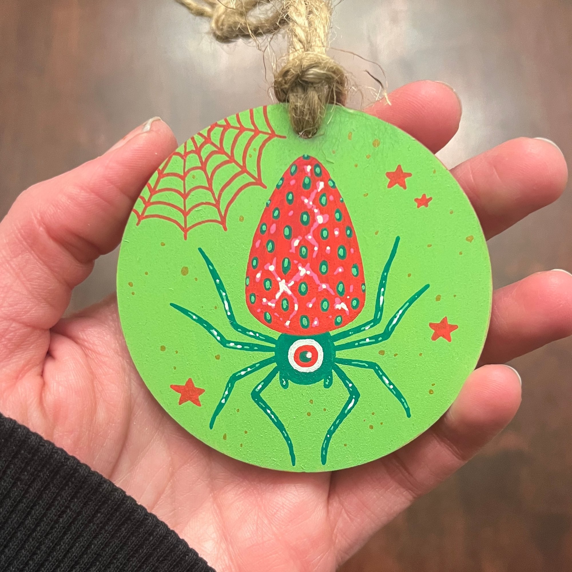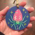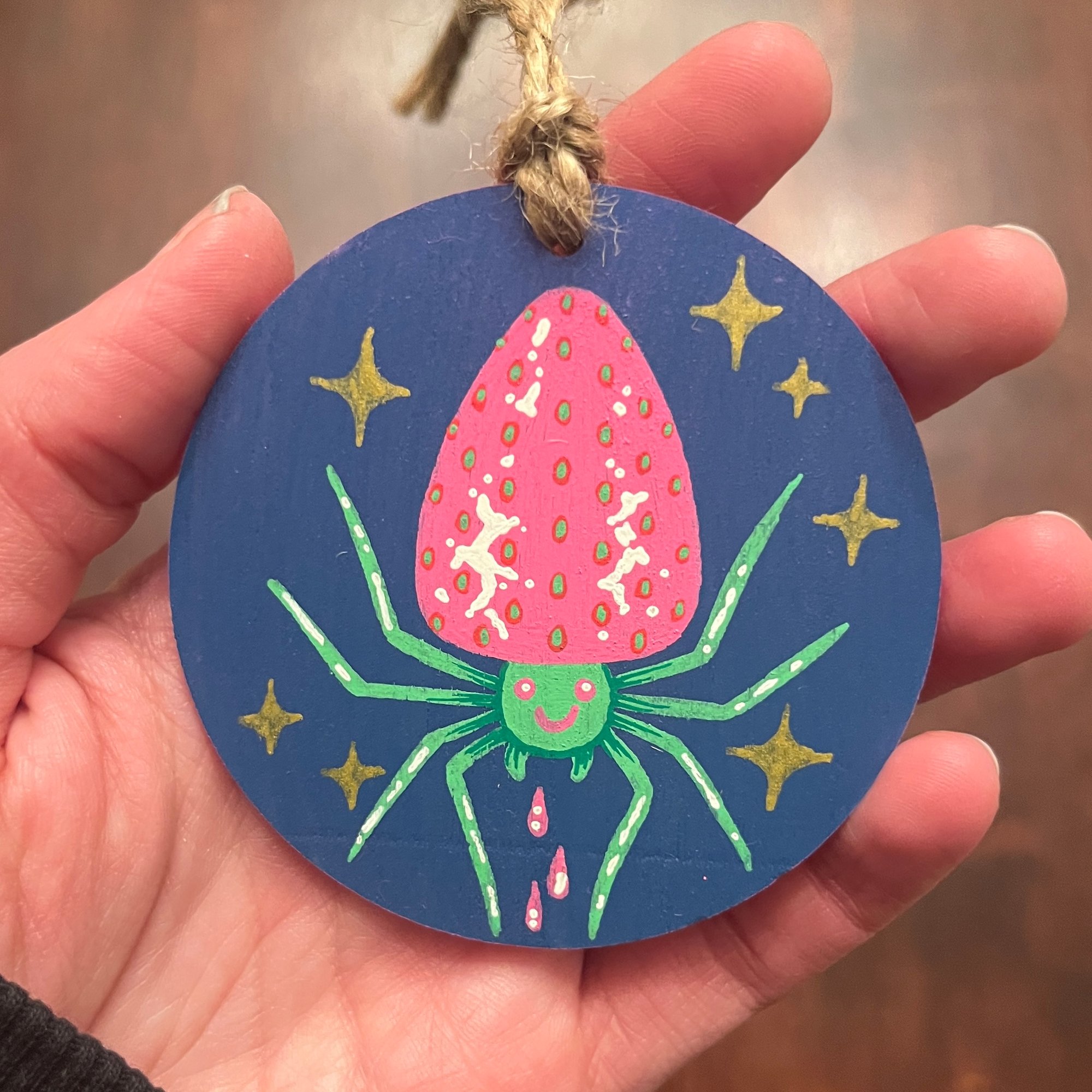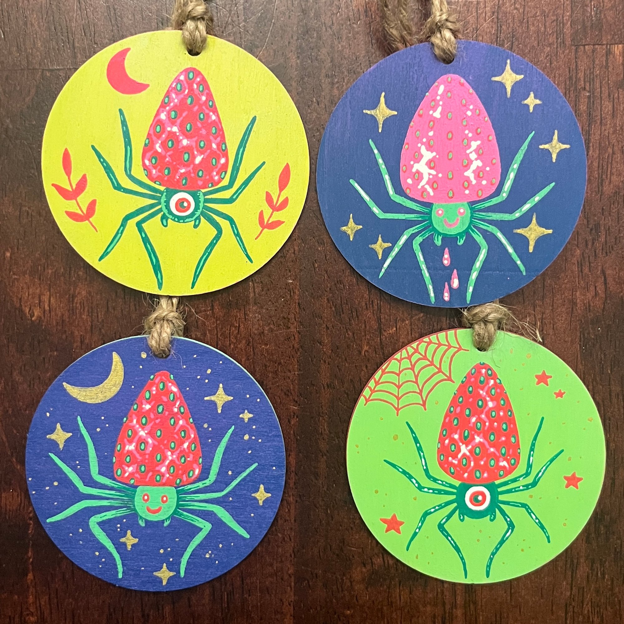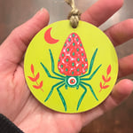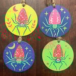 wooden ornaments hand drawn with acrylic paint markers measuring 2.75 inches tondo. each ornament is one of a kind and sealed with an iridescent varnish that gives it a subtle shimmer when light hits it.