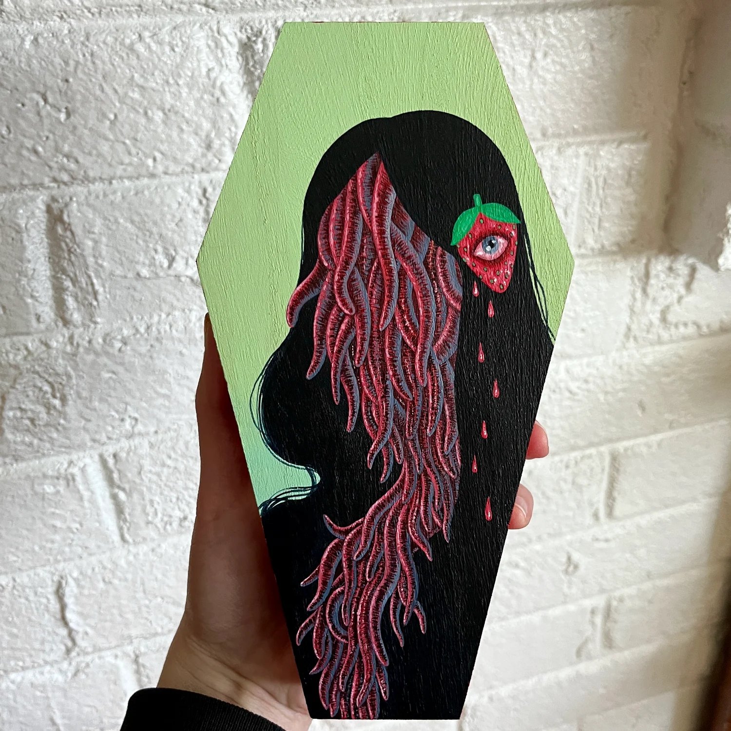 acrylics on wooden coffin measuring about 8 inches tall. sealed with a gloss varnish. coffin is freestanding but also has a sawtooth hanger on the back for hanging.