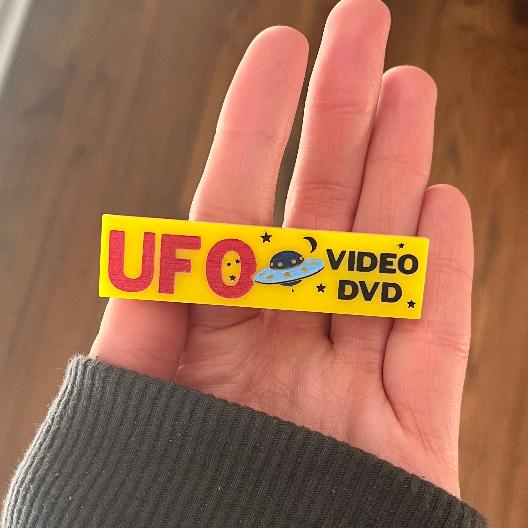 laser engraved and hand painted acrylic pin based on the southwest virginia landmark. those of us lucky (or unlucky) enough to visit this iconic video rental place in the ‘90s and early 2000s all have stories of being leered at by creepy men hanging around the back room and wondering why it smelled like cat piss when there was no cat on the premises. it was a truly magical place that, though long abandoned, still stands on the virginia side of the state border with tennessee along a cursed stretch of highway. i drive past it almost every day and since it’s been an important part the background of my entire life i wanted to commemorate the sign. i made a pin for myself at first, but other people wanted one as well, so here it is.