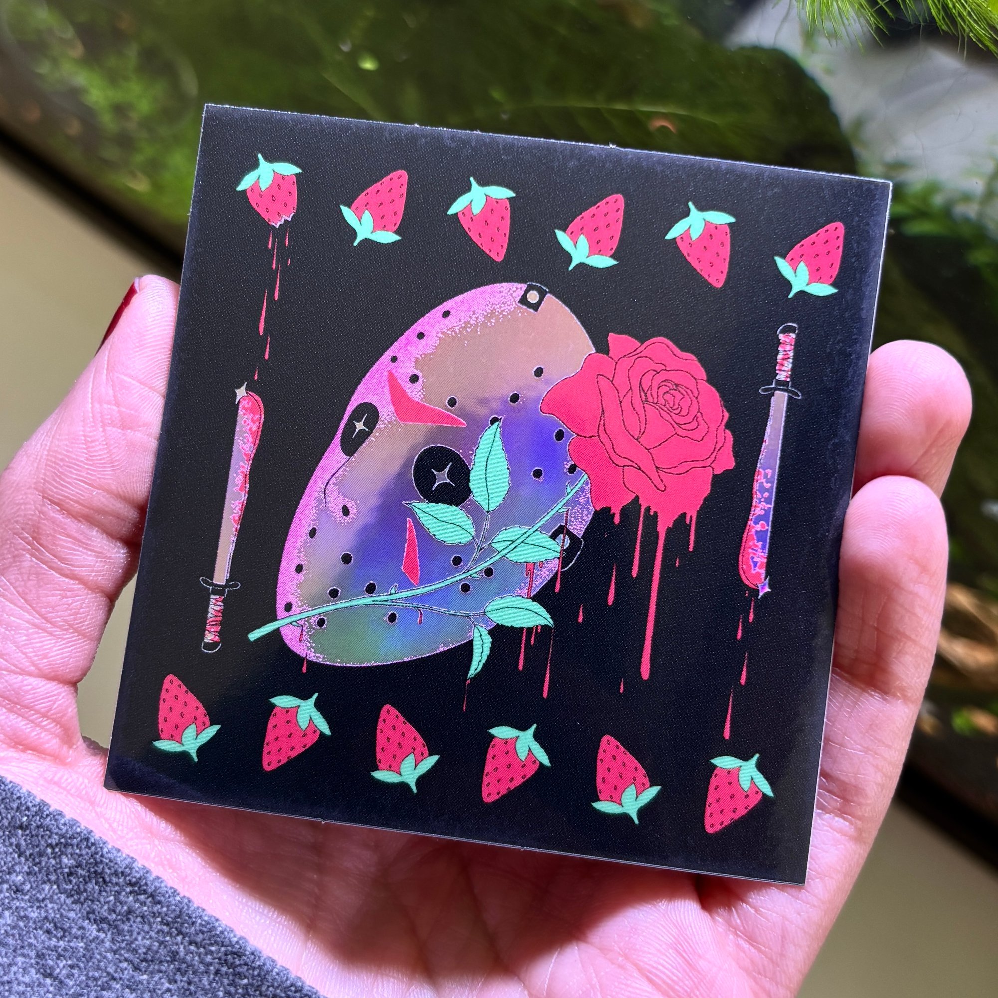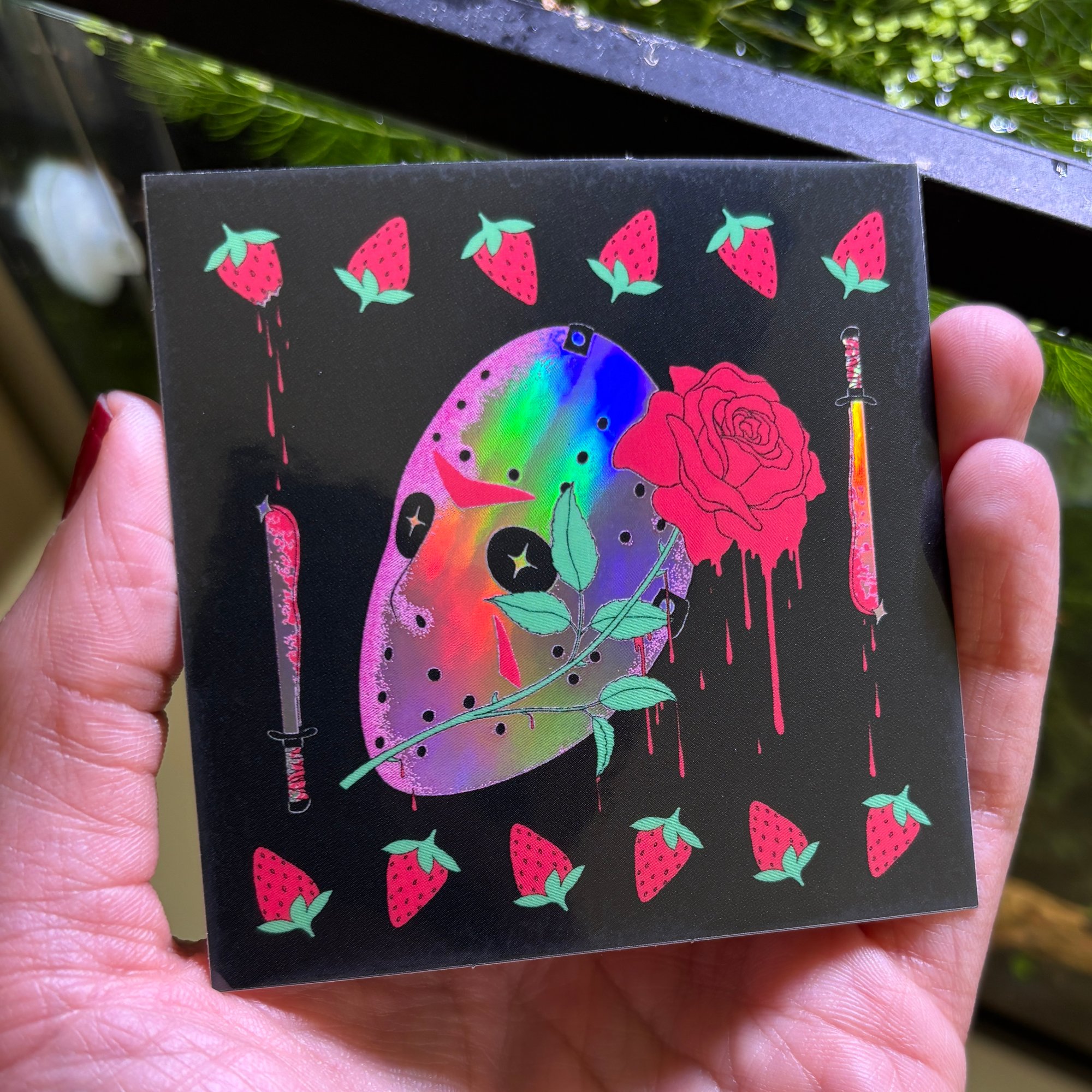 holographic sticker featuring a very romantic hockey mask. sticker measures about 3 x 3 inches. it's waterproof and uv resistant.