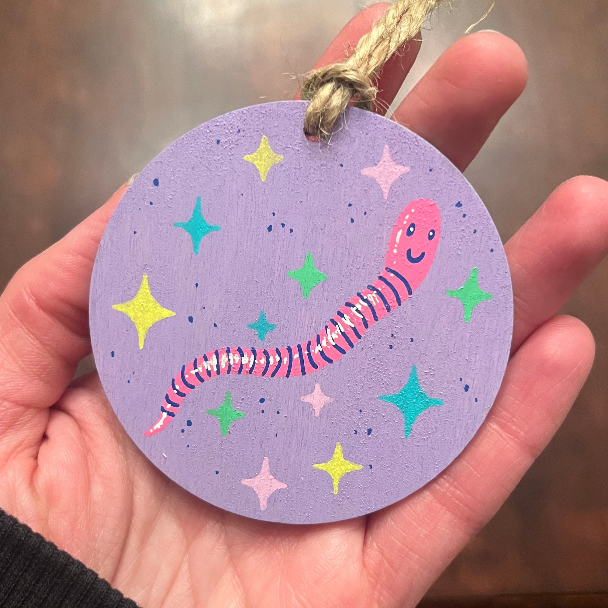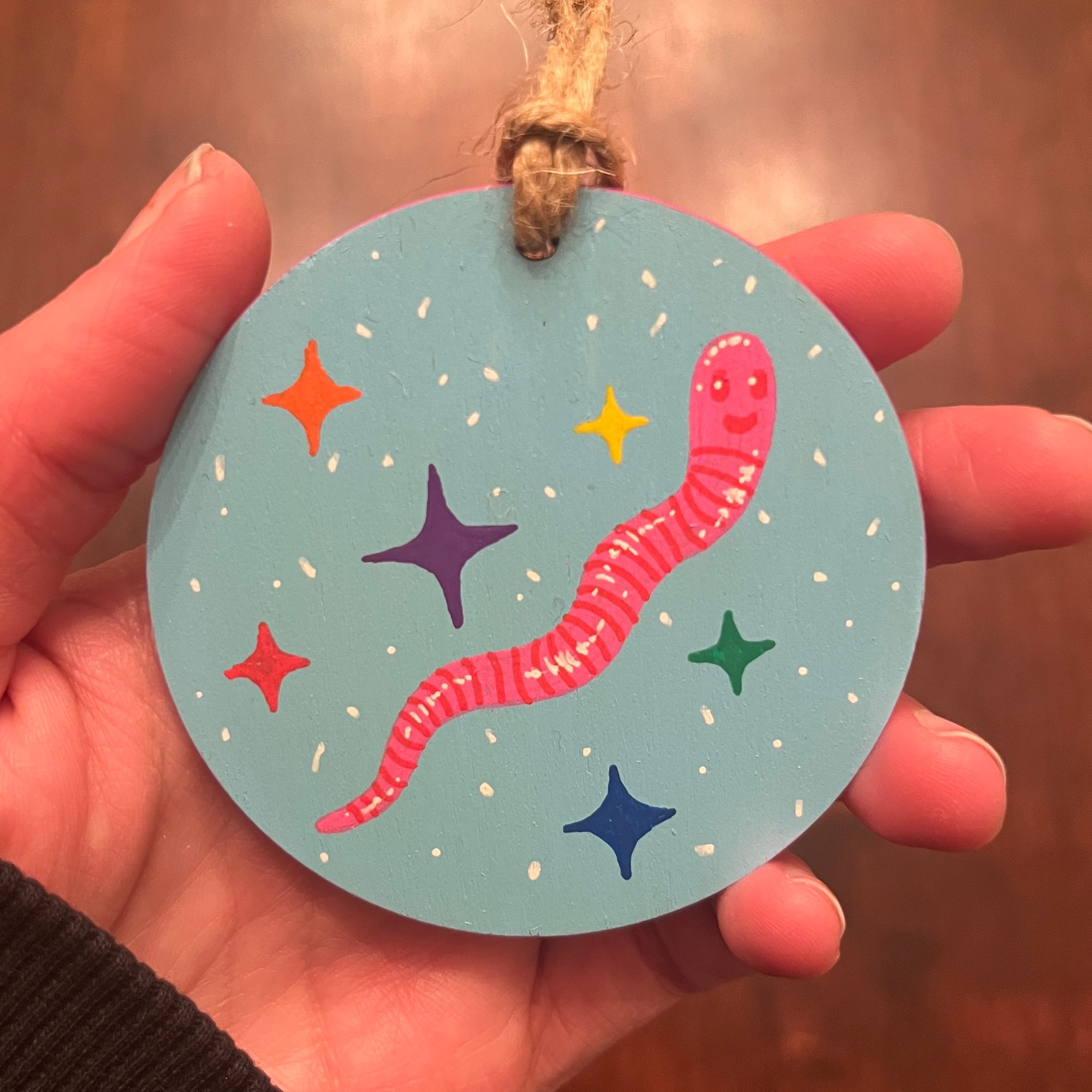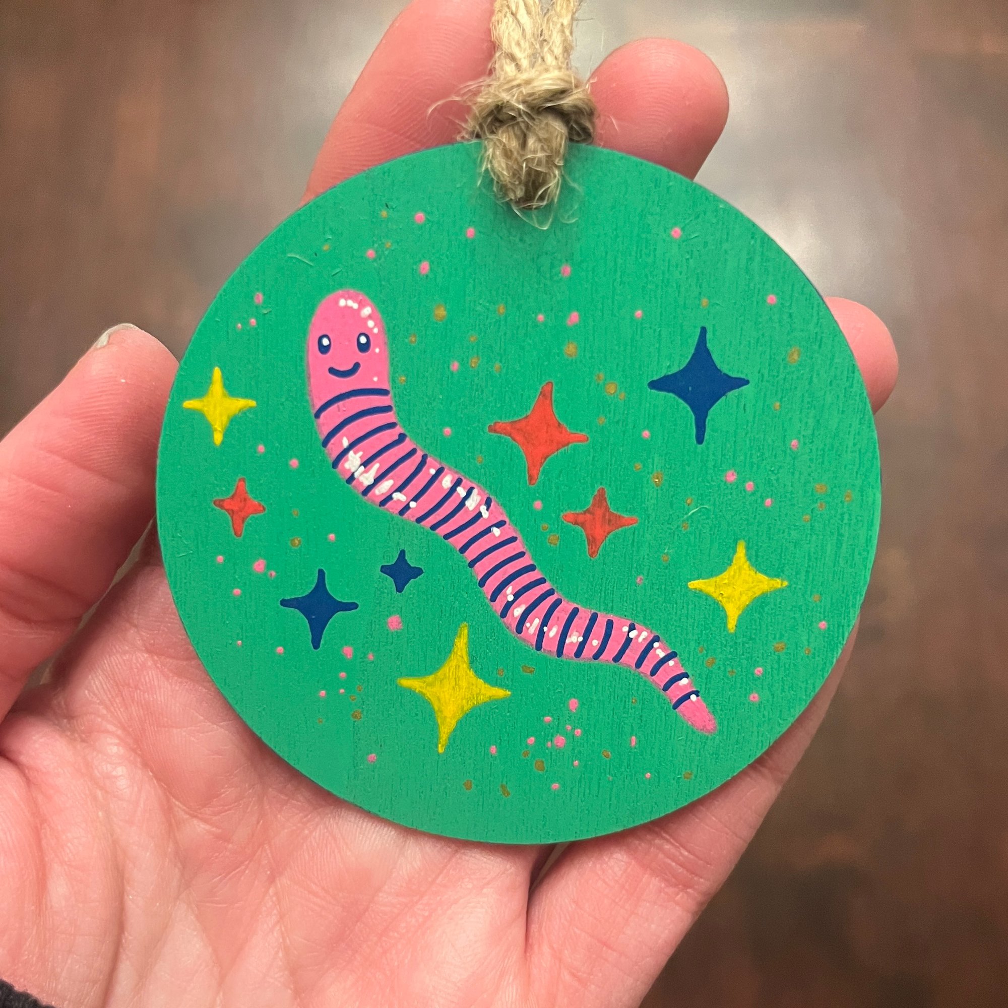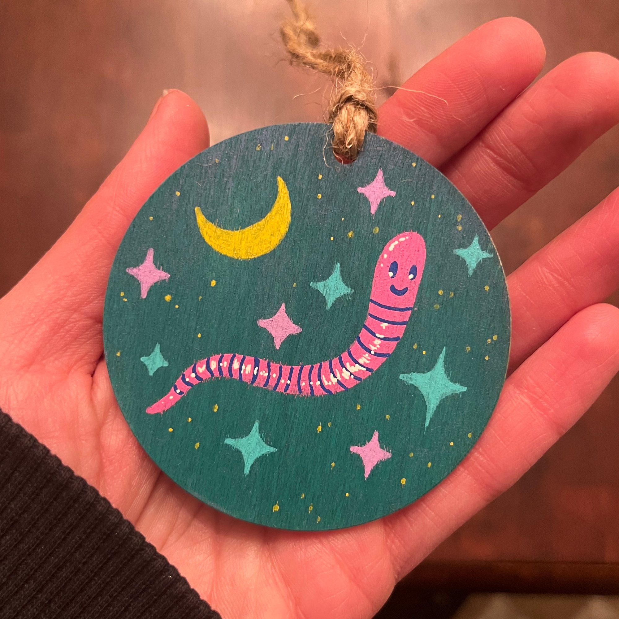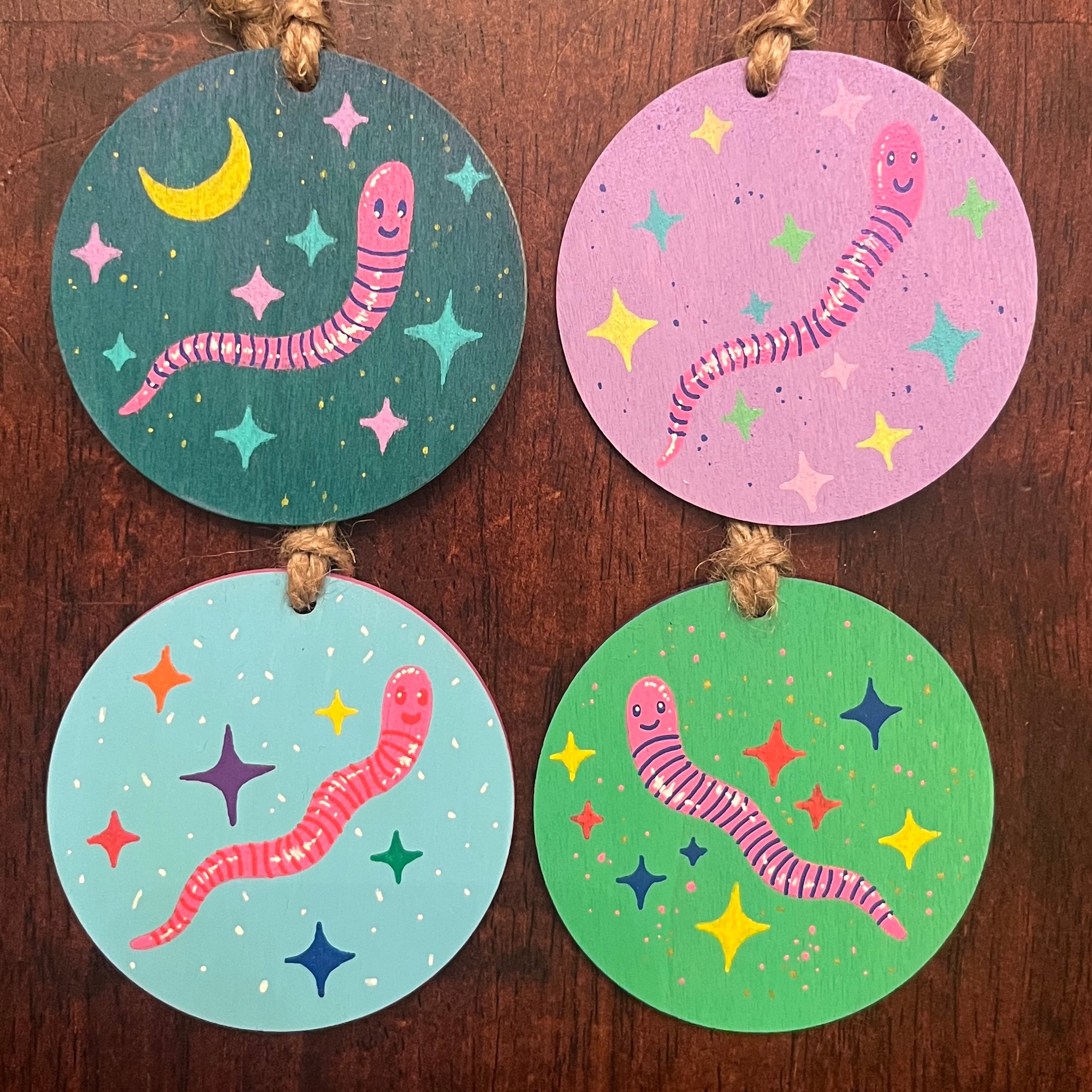 wooden ornaments hand drawn with acrylic paint markers measuring 2.75 inches tondo. each ornament is one of a kind and sealed with an iridescent varnish that gives it a subtle shimmer when light hits it.